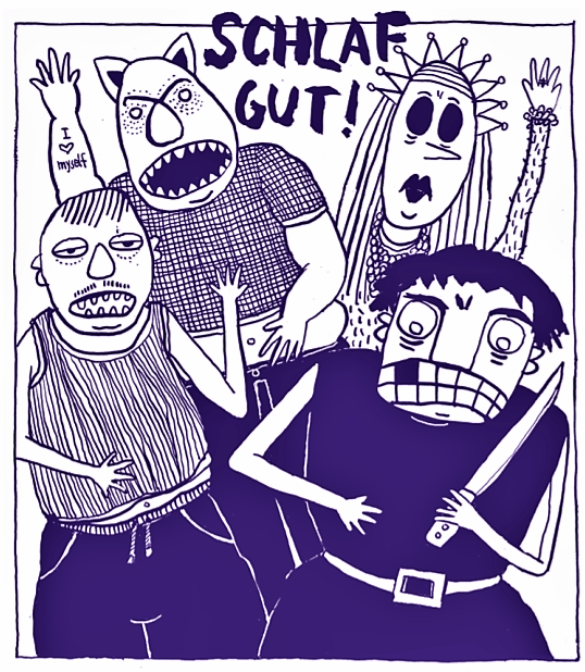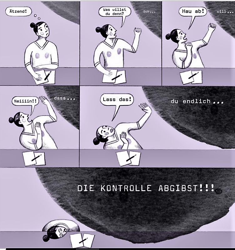 Wie immer ist „Spring“ eine Ausstellung der Stile, eine attraktive Überblicksschau zum Stand der Illustrations-Kunst. Die Zeichnungen sind mal wie hingehaucht und mal wie eingekerbt, wirken mal malerisch und dann wieder wie ein Comicstrip in nuce. Die Mitwirkenden sind: Larissa Bertonasco, Romy Blümel (mit gleich drei Geschichten), Almuth Ertl, Anke Feuchtenberger, Doris Freigofas, Katharina Gschwendtner, Inga Kählke, Mari Kanstad Johnsen, Marah Mazzetti, marialuisa, moki, Nina Pagalies, Katrin Stangl (von der auch das Cover stammt, das in der Dunkelheit leuchtet), Kati Szilágyi, Birgit Weyhe (deren Geister-Quartett zum Finale ein herzliches „Schlaf gut!“ entbietet) und schließlich Stephanie Wunderlich. Einen Einleitungstext gibt es von Karen Köhler, die dem Film „Ghostbusters“ entnommen hat, wie man die unwillkommenen Geister bändigen kann – also im Prinzip.
