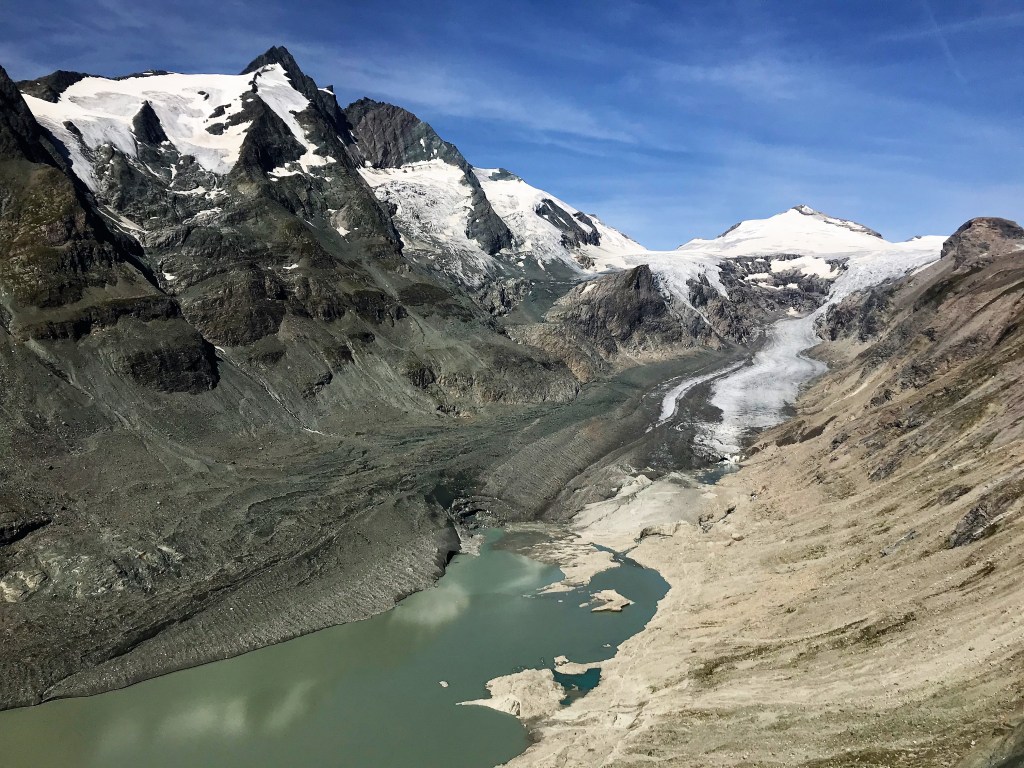 Auf der Rückreise von Venedig fuhren wir über den Plöckenpass nach Heiligenblut am Großglockner. Fabelhaft. Auf der Kaiser-Franz-Josefs-Höhe, mitten im Nationalpark Hohe Tauern, öffnet sich ein Parade-Panorama mit Österreichs höchstem Berg (3798 Meter) und dem größten Gletscher des Landes, der Pasterze, die sich allerdings mehr und verdünnisieret. Steinböcke soll es hier auch geben, aber wir haben nur Murmeltiere beobachten können. Einige Mini-Ausstellungen gibt es hier oben auch: Eine über den mühsamen Aufstieg der Bergsteigerinnen in der scheinbaren Männerdomäne, weiter die Kunstausstellung „Alpenliebe“ (eine Fotoserie zeigt Martin Kippenberger als beeindruckter Flachlandtiroler in alpiner Höhe), dann noch eine Präsentation von historischen Autos und Motorrädern – offenbar ein Tribut an die vielen motorisierten Touristen, die auf der fantastischen Großglocknerstraße unterwegs sind.