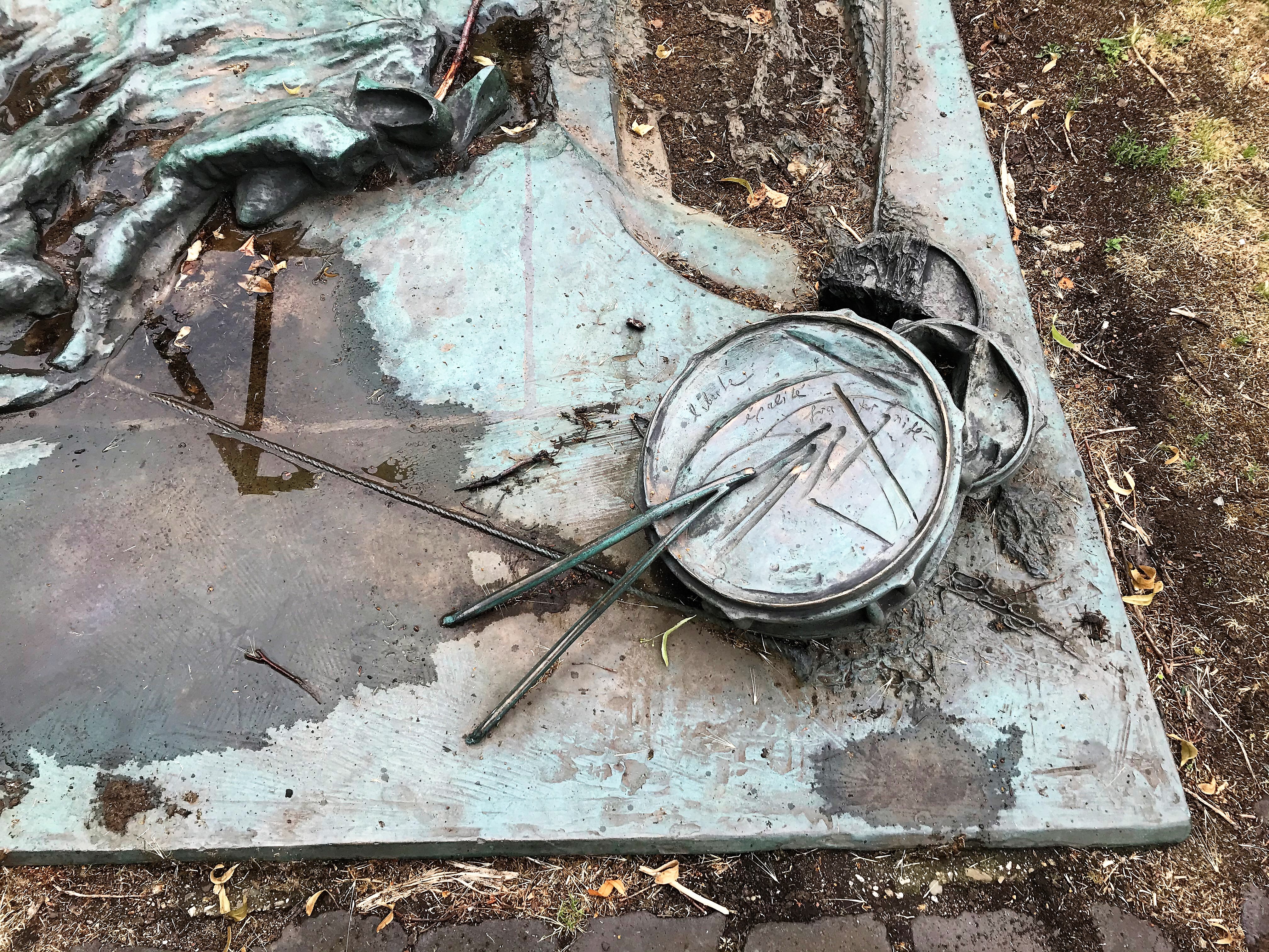 Heine-Denkmal von Bert Gerresheim am Schwanenmarkt. Rechts ein Detail mit Bronzetrommel. Fotos: Bücheratlas