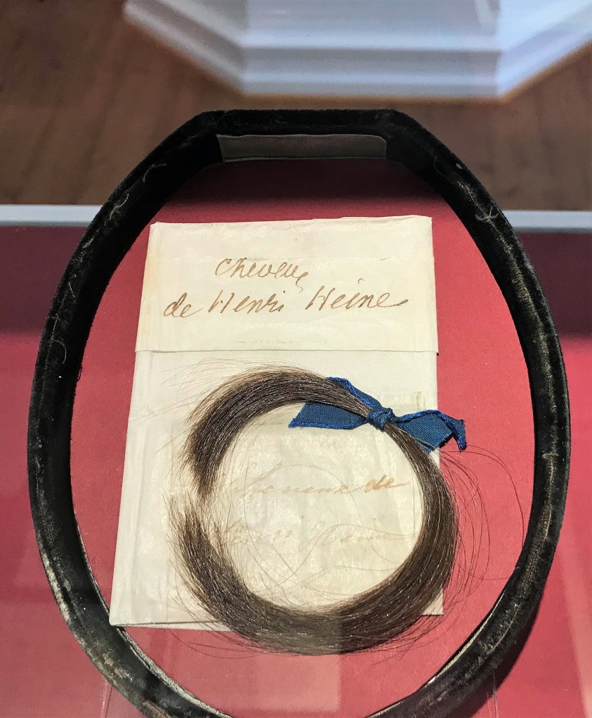 Unterwegs blickt der Besucher auf Porträts des Schriftstellers in Öl und Bronze und auf Briefmarken. Sehr persönlich wird es mit der Haarlocke, die von einer blauen Schleife zusammengehalten wird. Dazu gibt es einen erläuternden Zettel von Heines Ehefrau Mathilde: „Cheveux de Henri Heine“. Auch die Gänseschreibfeder im violett ausgeschlagenen Etui wird dem Dichter zugeschrieben. Sie gleicht derjenigen der Heine-Skulptur, die im Innenhof des Instituts auf einer Fensterbank platziert worden ist.