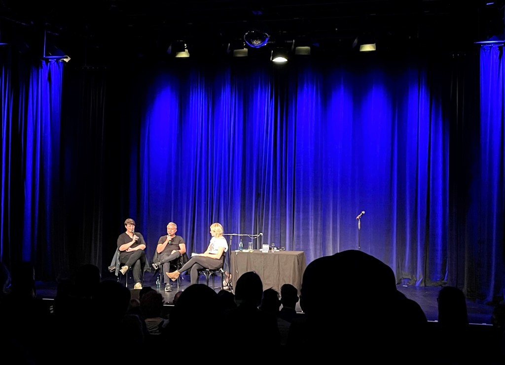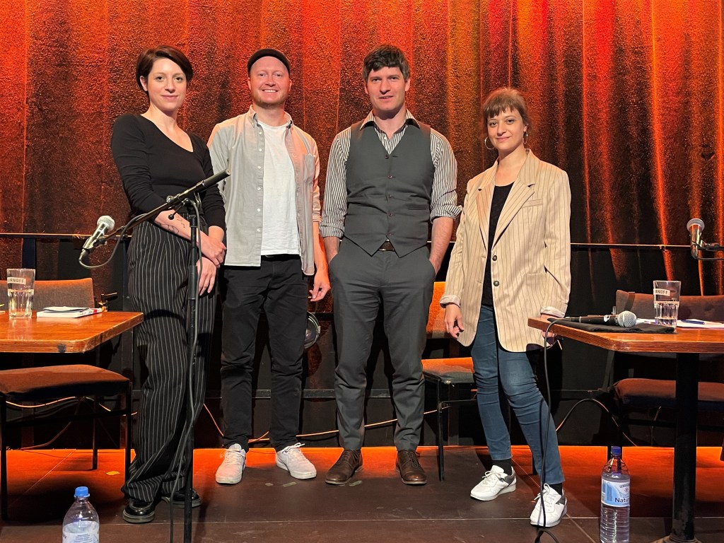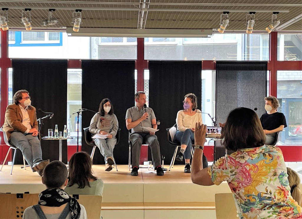 Los geht es um 16 Uhr mit der Zukunft der Literatur! In der Zentralbibliothek stellt sich die „Kölner Schreibschule für Jugendliche“ vor, die 2003 aus einem Schreibwettbewerb hervorgegangen ist und von der SK Stiftung gefördert wird. Patrick Findeis, der aktuelle Leiter der Einrichtung, klärt zunächst einmal auf, dass der Aspekt „Schule“ nicht im Zentrum stehe, sondern das Gespräch über Texte und Textideen. Die Schreibschule sei „ein Freiraum für Autorinnen und Autoren.“ Ein „Safe Space“. Der öffnet sich mehrmals im Jahr an einem jeweils langen Wochenende von Freitag bis Sonntag. Mit Erfolg – wie einige der bislang rund 200 Teilnehmenden auf dem Podium beweisen. So liest Gesa Jessen aus dem Manuskript „Ein lautes Lied“, das im Verlag Matthes & Seitz erscheinen soll. Darin taucht der Satz auf: „Es schreiben die Einsamen.“