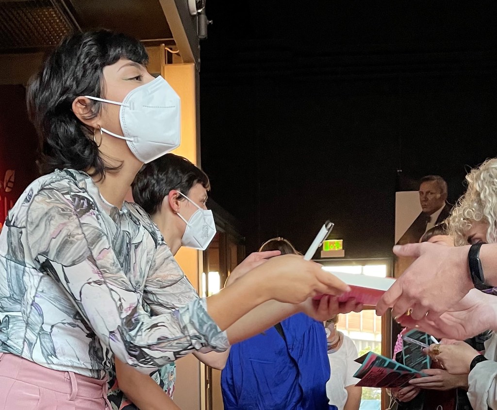 Seyda Kurt muss sich ab und an mal strecken. Im Cinenova signiert sie an einem Tisch stehend ihr Buch „Radikale Zärtlichkeit – Warum Liebe politisch ist“ (Harper Collins). Bestens besucht war die Veranstaltung der Initiative „Insert Female Artist“, die ihr nächstes Festuval vom 23. bis 26. September abhalten wird. Noch hat sich die Schlange der Fans nicht vollends aufgelöst, da beginnt im Kinosaal die Vorstellung der Kölner Literaturzeitschriften. Ihr schöner Titel: „Print ist nicht tot, riecht nur komisch“. Vertreten sind „KLiteratur“, „Kurze“ von der Kunsthochschule für Medien, „schliff“ von den Germanisten an der Universität Köln und „And She Was Like: BÄM!“ – wobei da der Akzent doch eher auf der Fotografie liegt. Die jeweilige Reichweite der Publikationen, das machen die Verantwortlichen im Gespräch mit Yannic Han Biao Federer deutlich, ist übersichtlich. Doch der Spaß, eine solche „Spielwiese“ zu pflegen, sei erheblich. Und nicht zu unterschätzen sei die Bühne, die da zur Verfügung gestellt werde. Denn wer sich für eine Förderung bewerbe, der müsse etwas vorweisen können – am besten eine Veröffentlichung. In diesen Dienst stellt sich zumal „Kurze“ (deren jüngste Ausgabe wir HIER vorgestellt haben). Die Autorin Kamala Dubrovnik, die einen Text vorträgt, bestätigt die Einschätzung: „Die Sichtbarkeit ist sehr wichtig.“