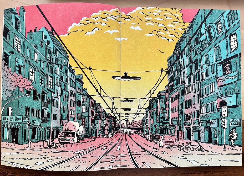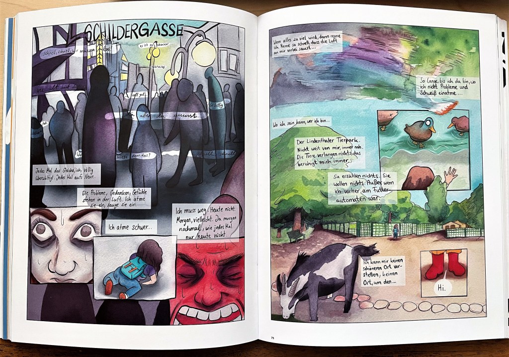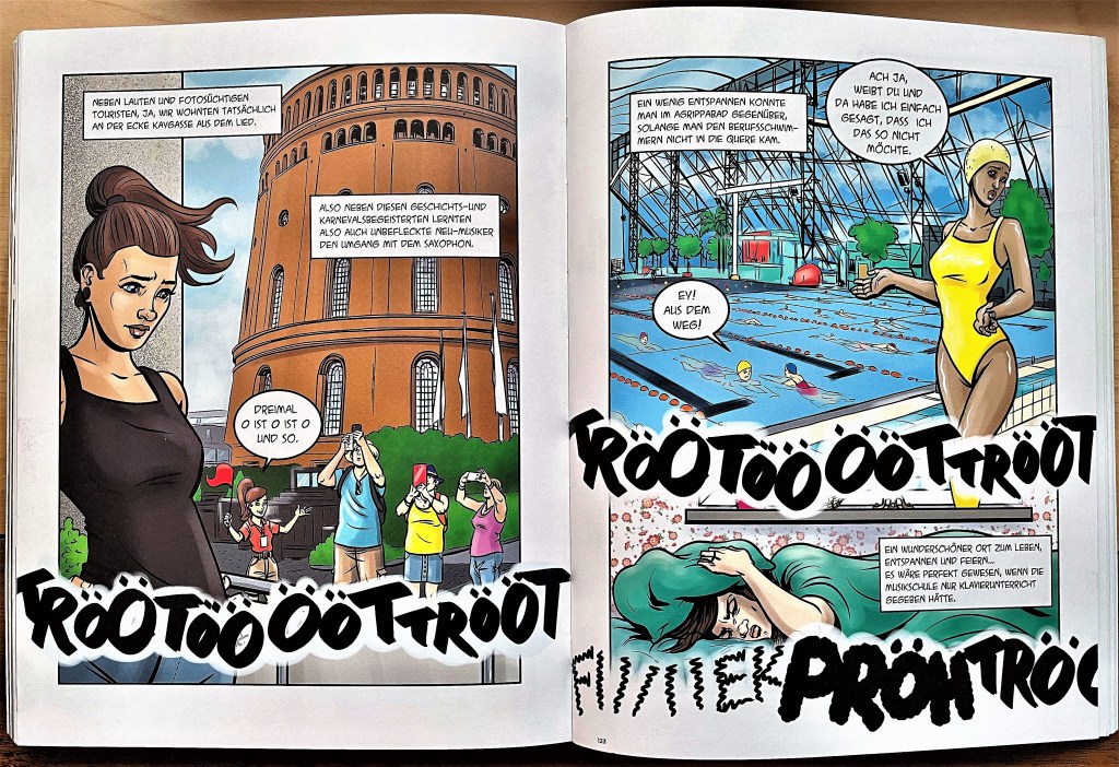 „Mit Comics durch Köln“ ist ein intensives Statement der Szene. Da wird Köln gefeiert für die „Riviera“ in Rodenkirchen (Dirk Meissner); für die Club-Szene, auch wenn einige Institutionen schließen mussten (Tristan Wilder); für die Buchhandlung Walther König (Ferdinand Lutz), die nichts anderes als „das Mekka“ ist; für das Japanische Kulturinstitut (Schilling & Blum), das – „typisch Köln“ – nicht hinreichend gewürdigt wird. Auch der Tierpark in Lindenthal ist im Prinzip ein guter Ort (Brü). Und Martin Böer beschließt seine grünstichige Stadtrundfahrt mit dem Geständnis: „Tief in der Brust sitzt die Gewissheit, dass ich es hier liebe.“