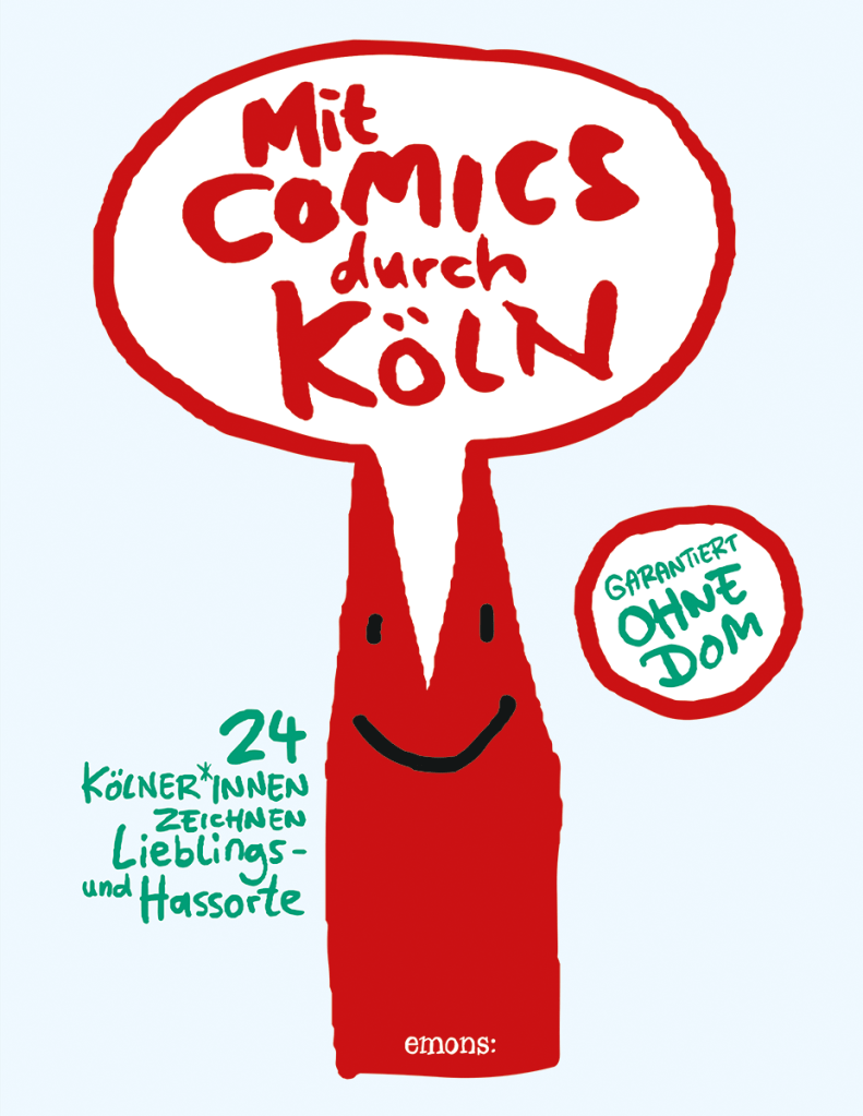 Garantiert ohne Dom – das war die Verabredung zu diesem Kölner Comic-Stadtführer. „Watt ne Schnapsidee“, schreibt Hella von Sinnen in ihrem Vorwort. Doch tatsächlich kommen die 24 durch die Stadt flanierenden Zeichnerinnen und Zeichner in ihren Bildergeschichten ohne die Domspitzen aus. Allerdings – auf dem Cover sind sie doch zu sehen. So ganz geht es eben doch nicht ohne Dom, und darum lächelt er wohl auch so breit.