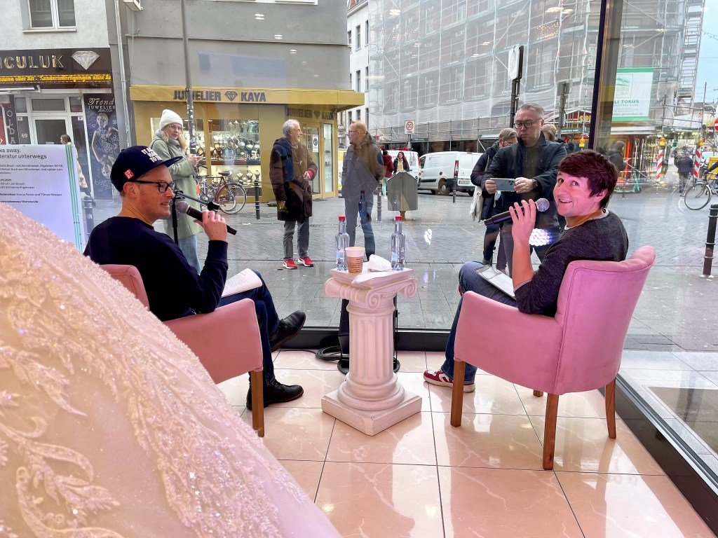 Das Geschäft ruht nicht. Während sich im Hintergrund eine Heiratswillige mit einem Beratungsteam in die festlichen Roben vertieft, schildert der gebürtige Ostfriese und zeitweilige Kölner Jan Brandt („Ein Haus auf dem Land“) seine Köln-Erfahrungen. Oha! Da findet er nicht viel Erbauliches in der verkachelten Stadt. Zumal die Zimmersuche, die er in seiner dramolettigen Lesung mit Tilman Strasser schilderte, ist gleichermaßen gruselig wie bizarr und komisch. Sie scheint sich im Großen und Ganzen genau so absurd-abschreckend zugetragen zu haben. Jedenfalls bekannte Jan Brandt im Gespräch, am Ende tatsächlich bei der ausländerfeindlichen Dame eingezogen zu sein, die von ihm hatte wissen wollen, ob er womöglich mit Willy Brandt verwandt sei. Nein? Gut. Die Antwort passte – denn andernfalls, sagte sie, würde er die Wohnung nicht bekommen. Zum Abschluss des Mietvertragsgespräch gab es dann von ihr noch ein strenges „Tschö mit Ö“. Immerhin – auf Besuch kommt Jan Brandt gerne in Köln vorbei. Dann und wann.