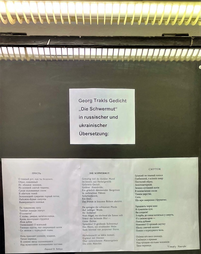 Ein Gedicht hat noch keinen Krieg verhindert oder gar beendet. Aber wenn man keine andere Chance hat, dann muss man auch diese nutzen. In Salzburg, wo der österreichische Dichter Georg Trakl 1887 geboren wurde, gibt es einen frischen Aushang im Schaukasten der Georg-Trakl-Forschungs-und-Gedenkstätte, die sich am Waagplatz befindet. Dort ist das Gedicht „Die Schwermut“ zu lesen, das 1914 entstanden ist. Und zu lesen ist es nicht nur auf Deutsch, sondern auch, dafür wurde aus aktuellem Anlass gesorgt, in russischer und ukrainischer Übersetzung.