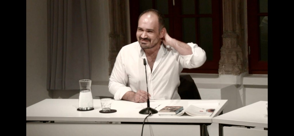 Dincer Gücyeter, der für seine Lyrik in diesem Jahr mit dem Peter-Huchel-Preis ausgezeichnet wurde, stellte seinen Debütroman im Gespräch mit Ulrich Noller vor. Wobei: „Roman“ steht zwar auf dem Cover des mikrotext-Verlags. Doch der Autor selbst räumt ein, nicht so recht zu wissen, was ein Roman sei. Und er habe auch noch niemanden getroffen, der ihm eine letztgültige Definition hätte geben können. Er habe es daher so gehalten: „Ich habe das geschrieben, was ich wollte.“ So finden sich in dem Band Theaterszenen, Märchen, Gedichte und Anekdoten. Er plädiere dafür, sagte er, nicht an vorgegebenen Formen zu kleben.