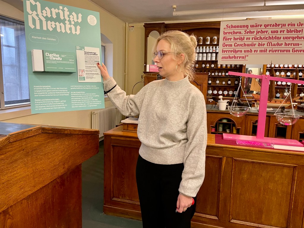 Überhaupt wird Klarsicht empfohlen. Deshalb gibt es am Ende des kurzen Ausstellungs-Rundgangs noch ein paar Medikamente aus der Apotheke. „Claritas mentis“ wird „bei allen Formen des Verschwörungsglaubens“ empfohlen. Und auf dem Beipackzettel zur Arznei „Provem Scientiam“ steht: „Zu verabreichen bei leichten und schweren Formen von Wissenschaftsferne, Verwechslung von Medizin und Aberglaube sowie Überschätzung von Youtube-Videos gegenüber staatlich anerkannten Universitätsabschlüssen in der Medizin.“