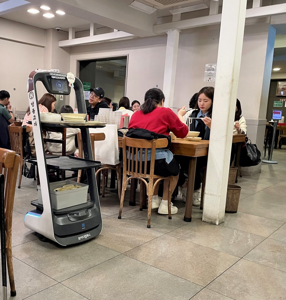 Zweimal, und damit ist das Thema Essen erst einmal beendet, brachte uns ein Roboter die bestellten Speisen. Leise surrend näherte er sich unserem Tisch, beladen mit Fleischplatten und Schalen mit heißem Gemüse. Nachdem wir ihn leergeräumt hatten, drehte er ab und verschwand Richtung Küche, erfolgreich programmiert, keinen Tisch und keinen Knöchel zu rammen.