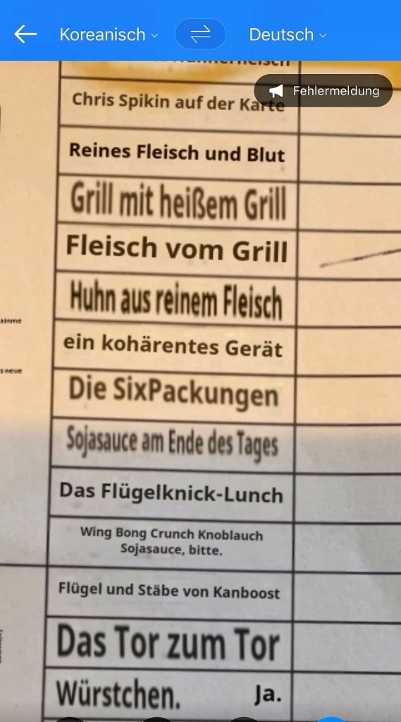 Die Auswahl der Speisen ist nicht einfach. Viele Speisekarten sind nur auf Koreanisch. Pech, dass wir die Sprache nicht beherrschen. Übersetzungs-Apps sind gerade bei Speisen oft recht blumig: „Grill mit heißem Grill“, „Huhn aus reinem Fleisch“, „ein kohärentes Gerät“, „Sojasauce am Ende des Tages“, „Das Flügelknick-Lunch“. Auch die Fotos helfen nicht immer weiter.