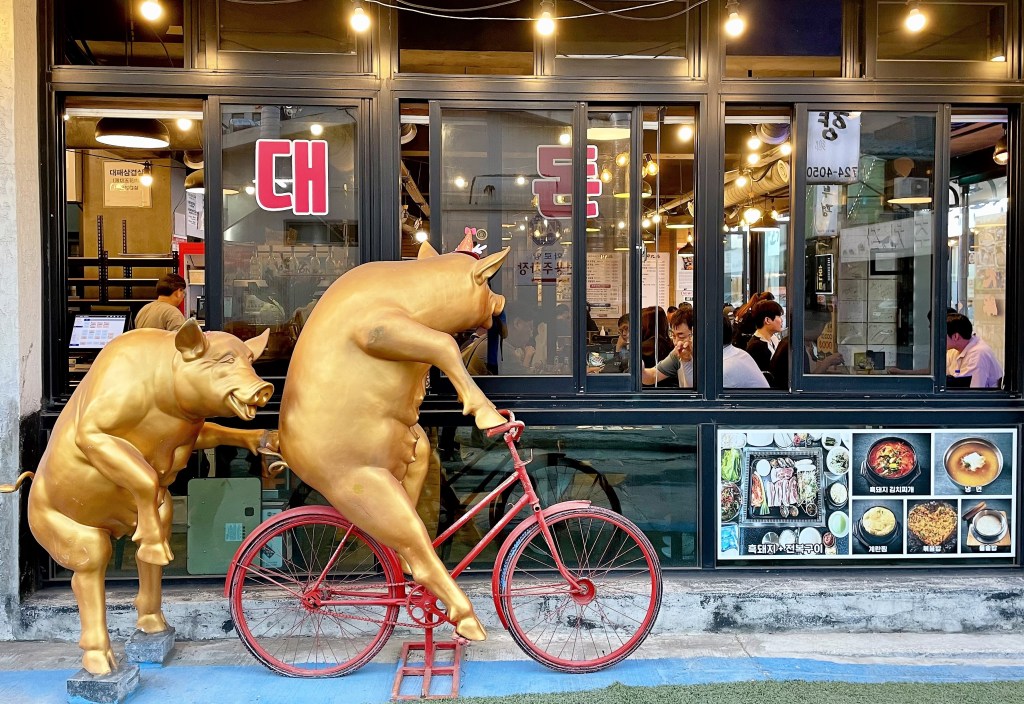 In der Pork Street auf der Insel Jeju isst man Schwein. Schwarzes Iberoschwein. Damit das auch jeder begreift, stehen vor den einschlägigen Restaurants Schweinefiguren aus schwarzem Plastik. Fröhlich lächeln sie die Gäste an, fast so, als gäbe es für ein Schwein nichts Schöneres, als vom Menschen verspeist zu werden. Die Kellnerin stellt Schalen mit rohen Pilzen, Gemüse und natürlich mit Kimchi auf den Tisch. Kimchi, fermentierter Chinakohl, der bei keiner Mahlzeit fehlen darf, dazu Platten mit Bauchspeck und anderem Schweinefleisch, das auf einer Grillplatte auf dem Tisch gebraten wird.