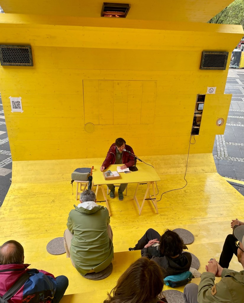 Adrian Kasnitz las zunächst einige August-Passagen aus seinem „Kalendarium“, dem poetischen Langzeitprojekt, das mittlerweile im achten Jahrgang vorliegt. Vor allem aber präsentierte er seinen jüngst und ebenfalls im eigenen Verlag veröffentlichten Gedichtband „Im Sommer hatte ich eine Umarmung“. Die darin versammelten Texte befassen sich mit Ereignissen der vergangenen drei Jahre – mit Krieg und Klimakrise, mit Vater und Mutter, mit Chef und Nicht-Chef, mit Menschen, die in Planen schlafen, und mit Verkehrsmitteln wie dem „Nicht einsteigen“-Bus, der auch am Neumarkt zu finden ist.