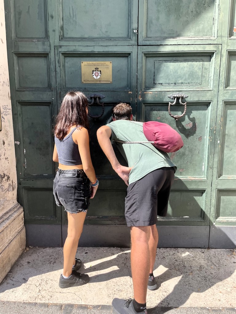 Das genaue Gegenteil, nämlich die Fokussierung auf die wohl berühmteste Sehenswürdigkeit dortselbst, bietet sich an der Pforte des Malteserordens. Auf der Piazza dei Cavalieri di Malta ist das blankbefingerte Objekt nicht zu verpassen – denn meistens, wir sagten es schon, macht sich schon jemand an der Tür zu schaffen.