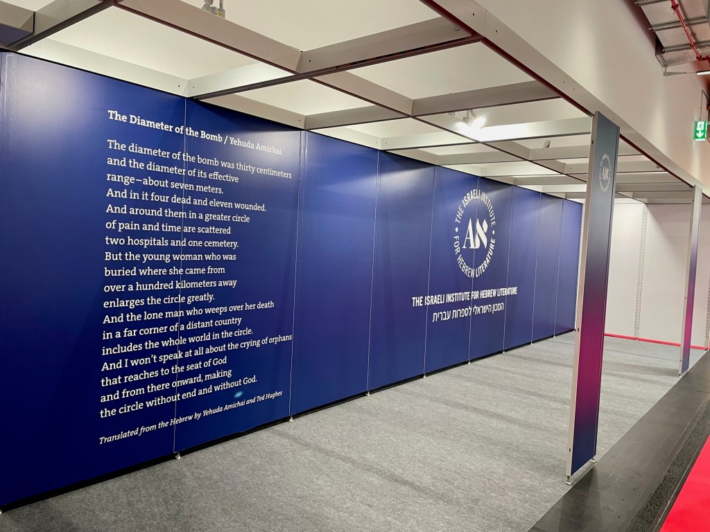 Nur ein verwaistes Rechteck tut sich auf. Das „Israeli Institute for Hebrew Literature“ präsentiert auf der Rückfront des Standes einer Aussteller-Koje ein Gedicht von Yehuda Amichai (1924-2000). Die ersten Zeilen, in der englischen Übersetzung von Amichai und Ted Hughes, lauten: „The diameter of the bomb was thirty centimeters / and the diameter of its effective / range – about seven meters. / And in it four dead and eleven wounded. / And around them in a greater circle / of pain and time are scattered / two hospitals and one cemetery (…)“ Das liest sich, als wäre es gerade erst geschrieben worden.