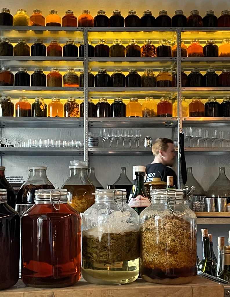 Das Restaurant Bruder hat einen Innenhof an der Raimund-Stiege. Außerdem eine Schanigarten-Zeile an der Windmühlgasse. Doch atmosphärisch noch besser geht es im Inneren zu, wo große Einmachgläser mit allerlei Aufgesetztem den Eindruck einer Alchemisten-Küche suggerieren. Was da gemixt wird, ist ein feines Vergnügen. Lässig, kräuterselig, intensiv – so wirkte das Menü auf uns! Mit einigen Grüßen aus der Küche und von der Bar. Die Angaben zu den Gerichten haben Poesie im Sinn. Unter „Endlich was Gescheits“ werden die Hauptspeisen aufgeführt: „Die Königin isst“ (Lamm, Erbse, Chicorèe), „Ernst sei Dank“ (Bratwurst, Erdapfel, Sardelle) oder „Zauber des Verzichts“ (Sellerie, Miso, Rhabarber). Der Nachtisch findet sich unter dem Hinweis „Deine Waage lügt“. Zwar geht man nicht wegen der Speisekartenprosa ins Restaurant – aber wenn sie einem Besuch des i-Tüpfelchen aufsetzt, ist sie willkommen.