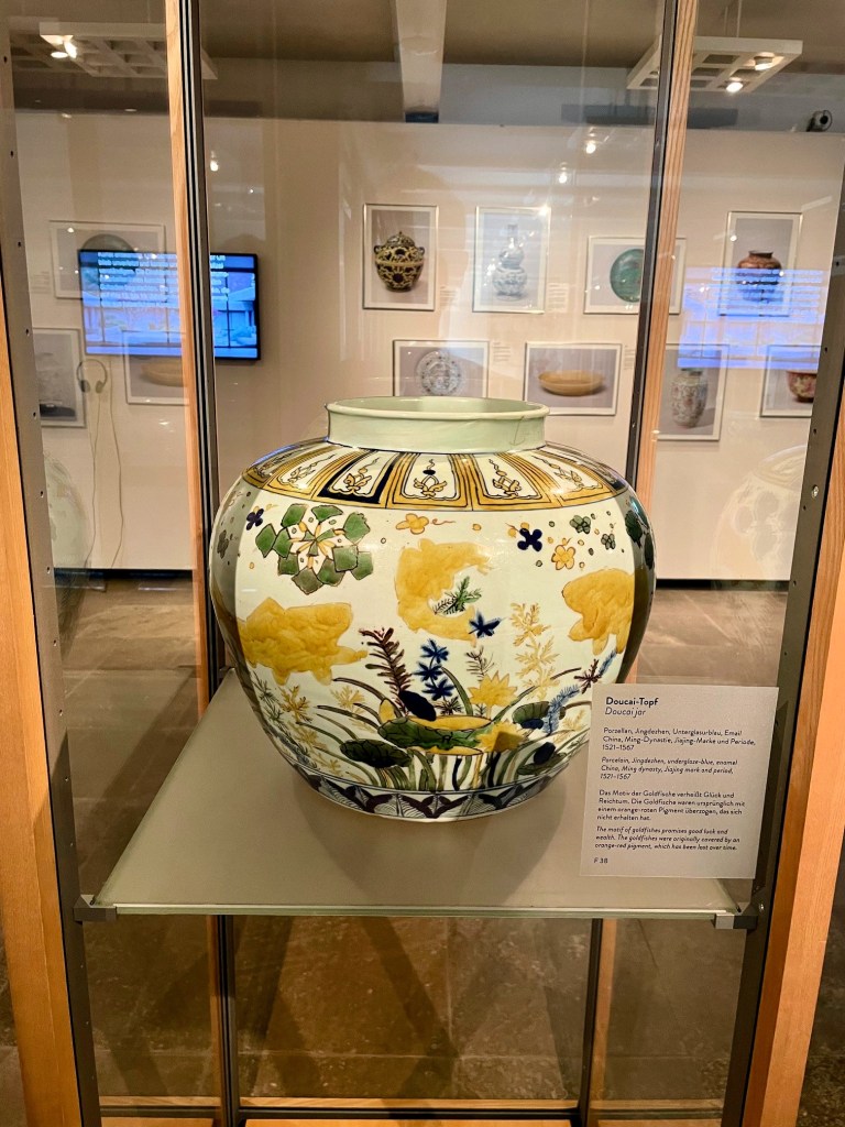Darunter befindet sich ein Lotustopf aus der Qing-Dynastie (Qianlong-Periode, 1736-95) in Gelb (für die Erde) und Blau (für den Himmel) – „zusammen repräsentieren sie das Yin-Yang-Prinzip“. Weiter ein Teller aus der Ming-Dynastie (Zhengde-Periode, 1506-21) ganz in Gelb – „nur Mitglieder der Kaiserfamilie durften gelbe Kleidung tragen und gelb-glasiertes Porzellan verwenden.“ Andere Nutzer gab es für die Drachenschale aus der Qing-Dynastie (Kangxi-Periode, 1662-1722) – „Geschirr mit auberginefarbenen Drachen auf grünem Grund wurde laut Palastregularien von den Konkubinen fünften Ranges (guiren) verwendet.“ Dann noch der Drachentopf aus der Ming-Dynastie (Jiajing-Periode, 1521-67) – auf ihm jagt der Drache „statt eines flammenden Juwels den Pilz der Langlebigkeit“.