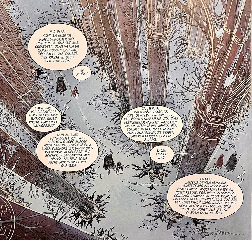 All das ist mit feinem Strich in Szene gesetzt. Er habe, schreibt Alcante, den Zeichnungen so viel Platz wie möglich eingeräumt und sich der Hilfe eines Mediävisten versichert. So kann man gespannt sein auf den zweiten Teil „Die Säulen der Erde – Das Feuer Gottes“, der im April 2025 erscheinen soll.