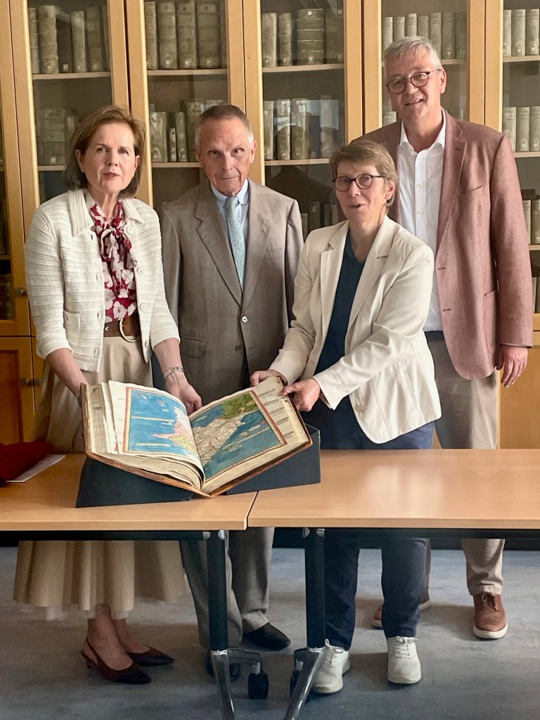 Nicht zuletzt sind es die „Buchpaten“, die ihren großen Beitrag leisten. Einer von ihnen ist Max Reiners. Der Unternehmer aus Mönchengladbach und Enkel Konrad Adenauers hat die Sanierung der famosen „Cosmographia des Ptolemäus“ finanziert. Nun konnte er in der Universitäts- und Stadtbibliothek begutachten, was er da ermöglicht hat. Nach Ansicht von Christiane Hoffrath, der Leiterin des Dezernats „Historische Bestände und Sammlungen“ an der USB, handelt es sich um eine der „Kronjuwelen“ der Sammlung. Den Wert der Inkunabel ordnet Direktor Neuhausen im „siebenstelligen, wenn nicht gar achtstelligen“ Bereich ein.