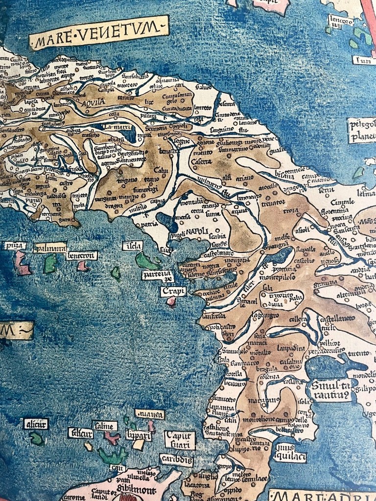 Das großformatige Buch punktet mit vielen doppelseitigen, in Holz geschnittenen und von Hand in strahlenden Farben ausgemalten Landkarten. Diese wurden vom Kosmografen Nicolaus Germanus im 15. Jahrhundert nach den Vorgaben des Claudius Ptolomäus aus dem 2. Jahrhundert gestaltet. Sie zählen zu den frühesten gedruckten Karten in Europa. Beim Kölner Exemplar sorgen zwei integrierte Notariatsurkunden auf Pergament für zusätzlichen Reiz.