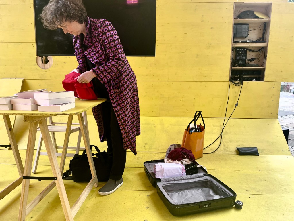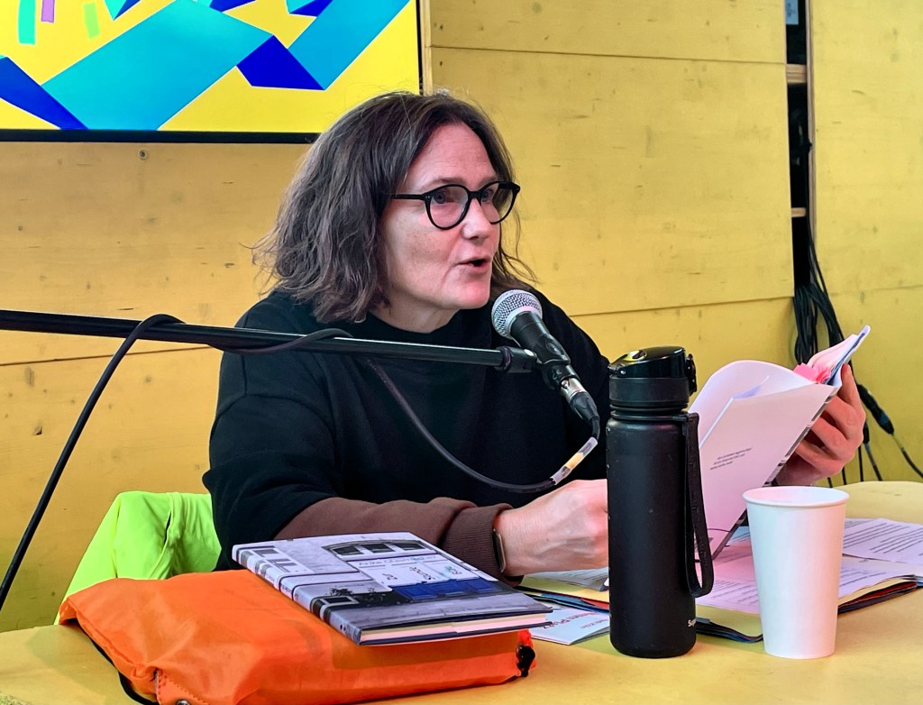 Anke Glasmacher liest an einem Tag, an dem der Brunnen auf dem Neumarkt nicht sprudelt. Aus unbekanntem Grund. Stattdessen gibt es reichlich Regen aus den tiefhängenden Wolken. Das Publikum hat sich davon nicht abhalten lassen: die Reihen sind auch diesmal gut besetzt. „Der Gelbe Pavillon hebt den Platz um einiges“, sagt die Autorin ins Mikrophon. Und er tat es diesmal ganz in Blau.