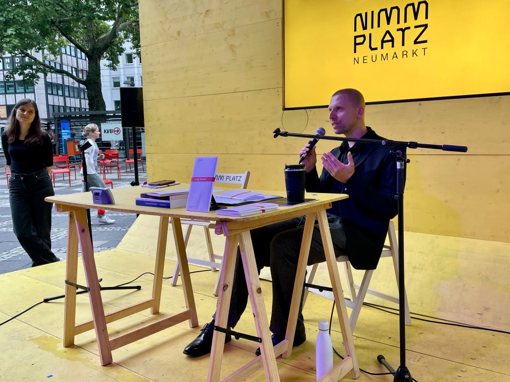 Bis zum 5. September wird der Gelbe Pavillon auf dem Kölner Neumarkt mit einem Kulturprogramm bespielt. Ein Schwerpunkt von „Nimm Platz“: das tägliche Literaturangebot. Schon einige Male haben wir darüber berichtet (die Links gibt es am Ende des Beitrags). Nun folgen Anmerkungen zu einigen der jüngsten Lesungen.