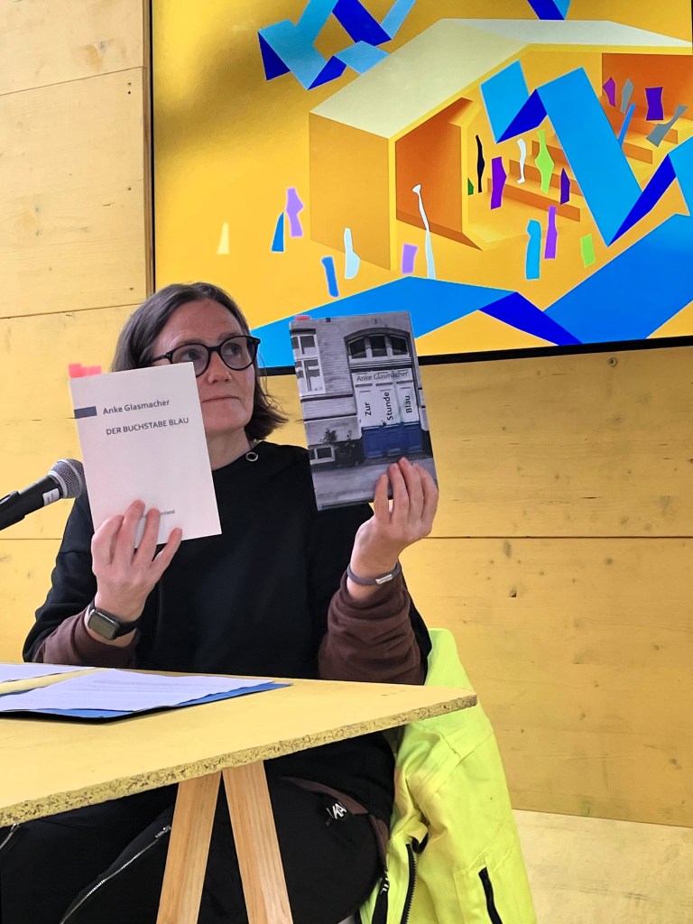 Ganz in Blau präsentiert sich der Gelbe Pavillon beim Auftritt von Anke Glasmacher. Die Lyrikerin ist mit ihren Büchern „Der Buchstabe Blau“ und „Zur Stunde Blau“ zu Gast. Was es mit der Farbe auf sich hat? Zum einen sei Blau in der Kunst sehr vertraut, wie Anke Glasmacher sagt, in der Dichtung wie in der Malerei. Daher habe sie einmal erkunden wollen, was sie selbst der Farbe abgewinnen könne. Zum anderen sehe sie Farben, wenn sie an Buchstaben und Zahlen denke. Die Ziffer 4 entspreche in etwa dem Blau, und wenn es ums Gelb gehe, assoziiere sie damit ein I oder – aber das sei dann schon eher ein Gelborange – ein E .