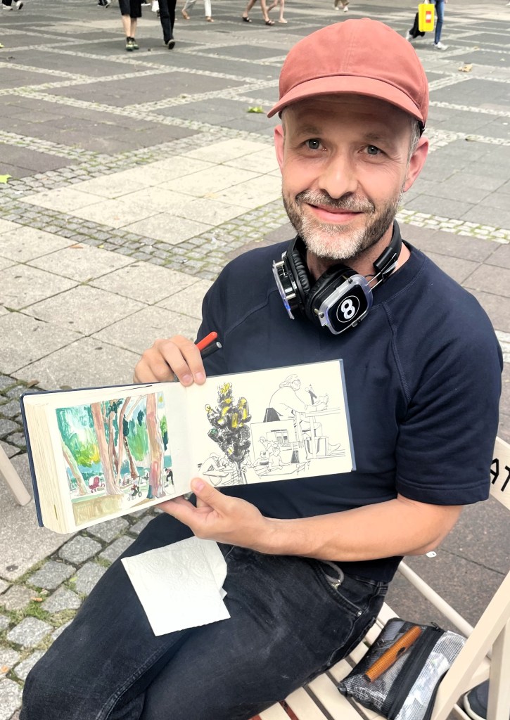 Den Auftritt von Wolfgang Schiffer verfolgte auch Claus Daniel Herrmann. Er hatte bereits im Juli seinen Auftritt mit der Graphic Novel „Pinke Monster“ (HIER); zudem ist er der Initiative „Nimm Platz“ dadurch verbunden, dass er den Programm-Flyer gestaltet hat. Jetzt hielt er mit Tusche und Feder in seiner Kladde fest, was sich da vor seinen Augen abspielte: Den übers Buch gebeugten Autor ebenso wie einige amüsiert dreinblickende Besucherinnen. Ob daraus ein Comicband wird? Das wohl nicht, meint der „Eventzeichner“. Schade. Aber vielleicht, denken wir, schmücken die Skizzen ja den „Nimm Platz“-Flyer im nächsten Jahr.