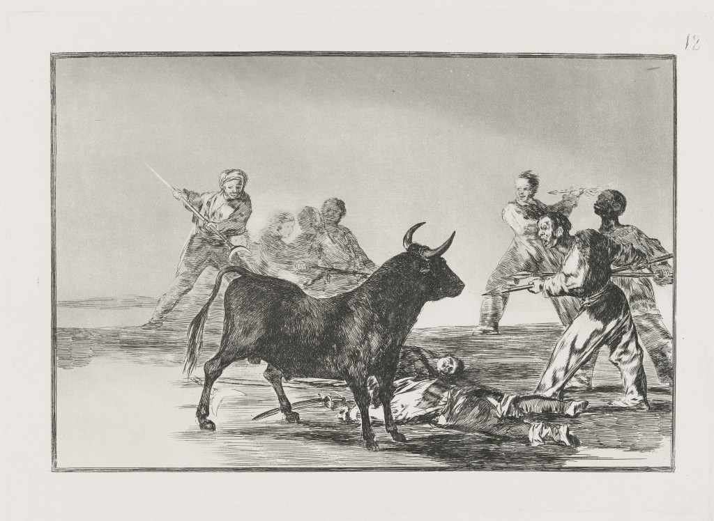 Es folgen die „Desastres de la Guerra“, die sich auf den Spanischen Unabhängigkeitskrieg (1808–1814) beziehen. Doch wird die dort waltende Grausamkeit so drastisch und grundsätzlich geschildert, dass man gleich den Bogen zur Gegenwart schlägt, zu Tod und Hunger in unseren Tagen. Weiter geht es mit der „Tauromaquia“, die dem Stierkampf gewidmet ist. Schließlich noch die unheimlichen „Disparates“, deren „Hermetik“, so sagen es die Herausgeber, den Künstler als „Vorreiter der Avantgarde“ erkennen lassen.