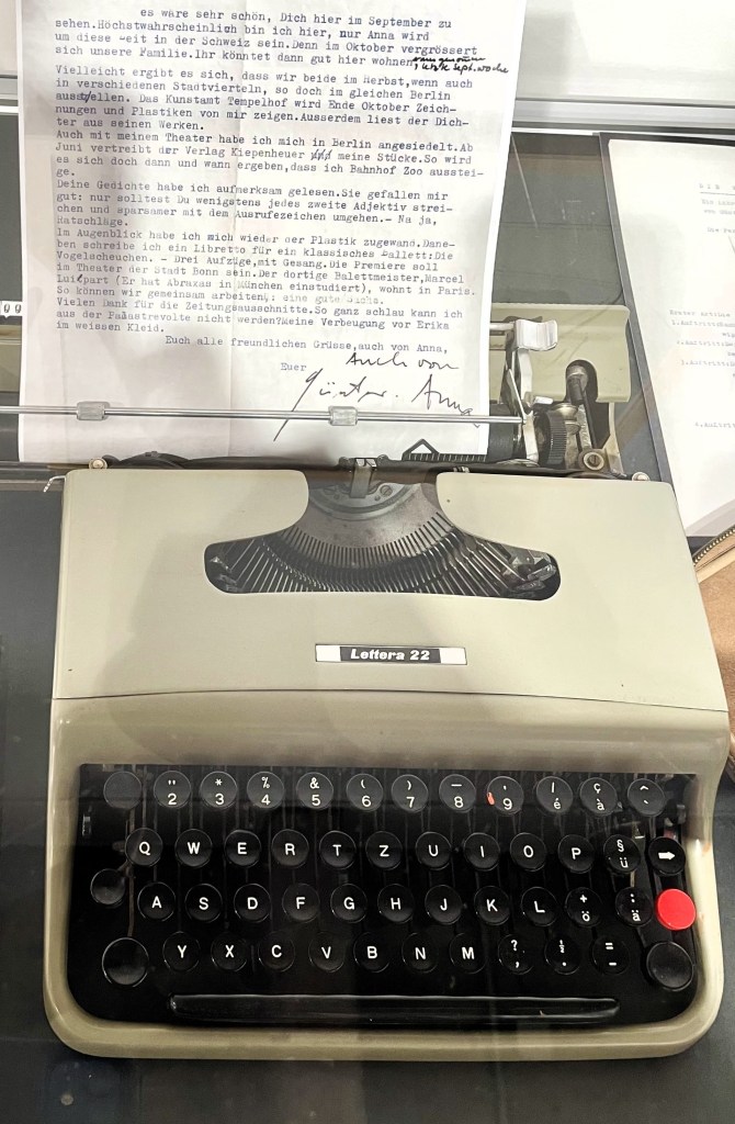 Es sei „in diesen Tagen“ gewesen, erfahren wir weiter, „dass der Autor „endlich den ersten Satz seines Romans ‚Die Blechtrommel“ gefunden habe: „Zugegeben …“ Die Schreibmaschine, auf der er ihn festhielt – ein Geschenk zur Hochzeit – ist in einer Vitrine zu besichtigen. Bei der Olivetti handelt es sich um eine Leihgabe von Bruno Grass, dem jüngsten der vier gemeinsamen Kinder. Weiter bietet die Schau Videos und Töne, auch einige Gemälde von Anna Grass, darunter Porträt und Selbstporträt.
