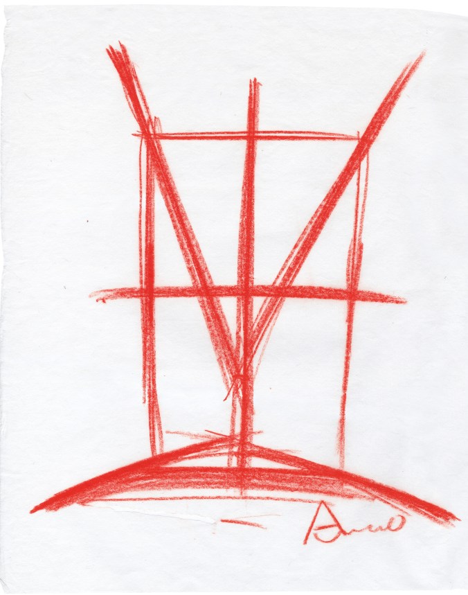 Der Titel deutet es schon an: Nicht die vollendeten Gebäude werden hier ins Zentrum gerückt. Vielmehr sind es die wegbereitenden Skizzen, Zeichnungen, Modelle und technischen Pläne. Es geht also um die Entwicklung von den ersten, mit leichter Hand hingeworfenen Linien bis zur maßstabgetreuen Feinstruktur – vom kreativen Schwung zum peniblen Bauplan. Wer diesen Prozess verfolgt, den Tadao Ando jeweils in wenigen Sätzen kommentiert, erhält einen faszinierenden Einblick in die architektonische Praxis auf Champions-League-Niveau. Zugleich bietet dieses Konvolut ein ästhetisches Vergnügen. Es ist gleichsam angewandte Kunst – gestaltet mit breitem Pinsel und spitzem Bleistift, auf Millimeterpapier und auch mal auf einem Werbeprospekt oder einer Bordkarte von Iran Air.