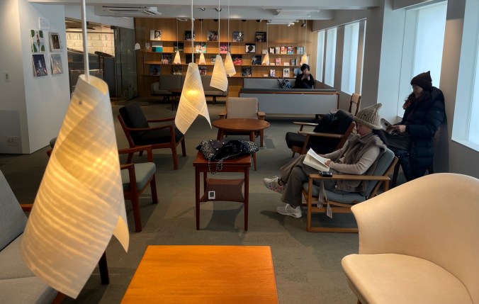 Das dritte Highlight der Bibliothek – nach der Treppe und dem Saal mit allen Erstausgaben – ist der Musiksalon. Dort werden Titel gespielt, die Murakami schätzt und von denen einige in seiner Prosa eine Rolle spielen. An dem Morgen, als wir in der Bibliothek waren, bot die Playlist diese elf Titel: 1 „Danny Boyle“ von Bring Crobsy, 2 „Blowin‘ in the Wind“ von Bob Dylan, 3 „Georgia on My Mind“ von Ray Charles, 4 „Autumn Leaves“ von Roger Williams, 5 „Early Autumn“ von Woody Herman, 6 „I’ll be Home“ von Pat Boone, 7 „As Time Goes By“ von Dooley Wilson, 8 Bruckner (WAB 102), 9 Bach (BWV 1048), 10 „A Hard Rain’s A-Gonna Fall“ von Bob Dylan, 11 „The End of the World“ von Skeeter Davis. Im Obergeschoss der Bibliothek gibt es schließlich noch eine Nachbildung des Arbeitszimmers des Autors sowie einen Ausstellungsraum. Aktuell und noch bis Mitte April geht es dort um die Verbindung von Jazz und Literatur zum „Black Feminism“.
