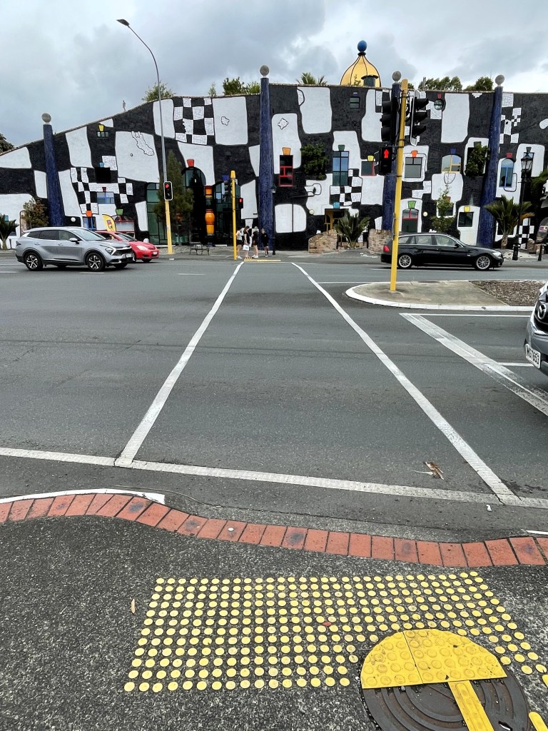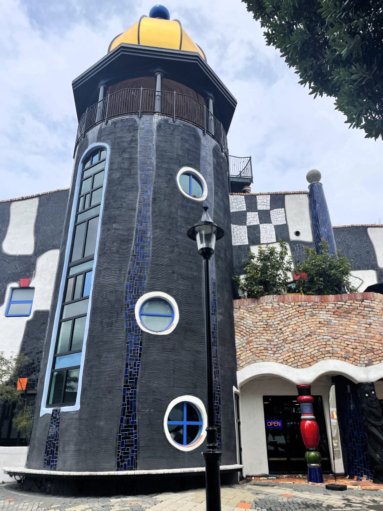 Schon von weitem sieht man die goldene Kuppel auf dem Dach des schwarz-weiß gekachelten Gebäudes in der Sonne leuchten. Vieles hier erinnert an das „Kunst Haus Wien – Museum Hundertwasser“ (auf das wir HIER eingegangen sind): krumme Wände, ein unebener Boden, viel Grün und Gold und weiße Keramik. Und natürlich eine Vielzahl von Bildern, Skizzen, Modellen und Dokumenten, die einen guten Überblick bieten über den Weg des Künstlers von Wien in das Tal von Kaurinui im Nordosten Neuseelands. In der ersten Etage ist ein kleines Café mit Terrasse untergebracht, von der aus man einen schönen Blick auf den Fluss hat.