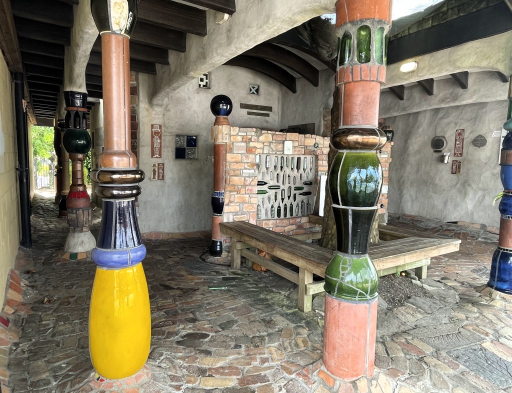 1999, ein Jahr vor dem Tod des österreichischen Künstlers, wurde das Toilettenhäuschen an der Gilles Street, der Hauptstraße von Kawakawa, eröffnet – und lockt seitdem Jahr für Jahr rund 250.000 Besucherinnen und Besucher in den kleinen Ort. Schließlich gilt die Einrichtung als eine der schönsten Toiletten der Welt. Das können wir natürlich nicht abschließend beurteilen. Zu den meistfotografierten des Landes gehört es auf jeden Fall.