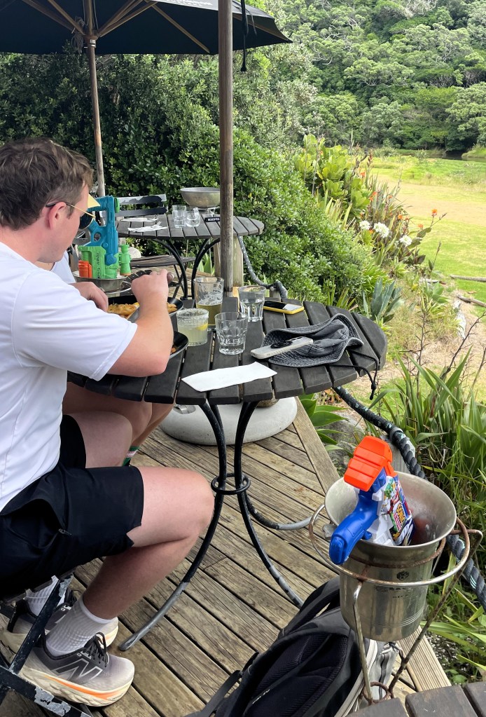 Auch im „Remarkable Café“ in Mangonui an der Doubtless Bay gab es offenbar ein Möwenproblem. Auf der Terrasse standen auf jedem Tisch gefüllte Wasserflaschen mit Sprühverschluss bereit, um die lästigen Vögel im Fall der Fälle zu vertreiben. Wir ließen uns davon jedoch nicht beirren. Zu einladend sah das Lokal am Waterfront Drive aus, als dass wir uns von ein paar Viechern (von denen wir übrigens keine Spur sahen) den Flat White madig machen lassen wollten. Und wir taten gut daran zu bleiben. Der Kaffee war heiß und stark, der Kuchen üppig bemessen und wunderbar saftig. Das Lokal ist darüber hinaus für seine feinen Fischgerichte bekannt. Nach dem Besuch lohnt sich ein kurzer Spaziergang durch den Küstenort. Einige der sorgsam restaurierten Holzhäuser stammen aus dem 19. Jahrhundert und beherbergen unter anderem Kunstgalerien und ein kleines Museum.